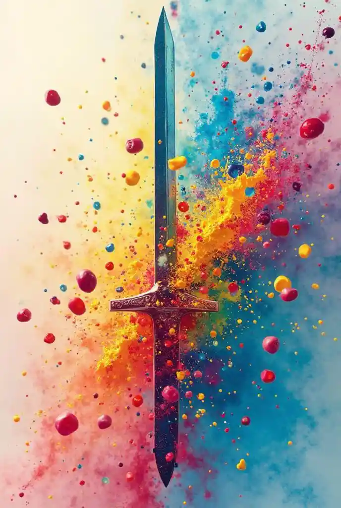 ((Close-up)). An abstract and expressive modern solution. Gradient rainbow lines mimicking the sweep of a sword. Double exposure with numerous flying cherry blo