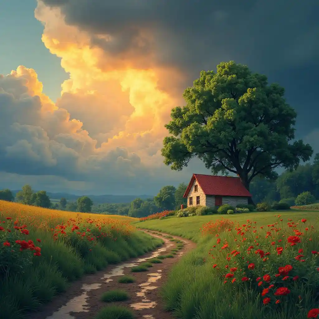 Create a landscape of a serene countryside scene during a gentle summer rain. A cozy cottage with a red roof is nestled near a large, lush green tree. The sky is filled with dramatic, billowing clouds in vibrant shades of orange and yellow, illuminated by sunlight breaking through, creating a striking contrast with the dark blue rain clouds. A narrow, winding path leads to the cottage, bordered by wildflowers in bright red and orange hues, and rich green grass. Small puddles form from the rain along the path. The overall atmosphere is peaceful an24.9K picturesque, with a harmonious blend of nature and tranquility, depicted in highl saturated colors to enhance the vividnes 0 and charm of the landscape