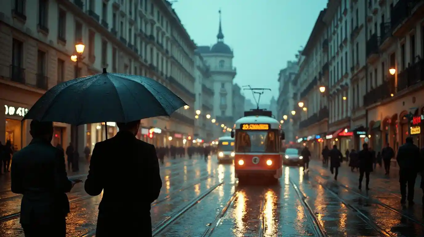 A highly detailed 35mm film photograph capturing an Italian metropolis on a rainy evening. The city's streets are wet, reflecting the lights from buildings, cars, and street lamps. Pedestrians walk with umbrellas, their silhouettes slightly blurred by the raindrops. The architecture is a blend of modern and historic buildings, typical of cities like Milan or Rome, with cobblestone streets and modern high-rise buildings in the background. Trams pass by, leaving light trails that add to the dynamic atmosphere. The overall mood is moody and atmospheric, with muted tones, soft film grain, and a vintage analog feel.
