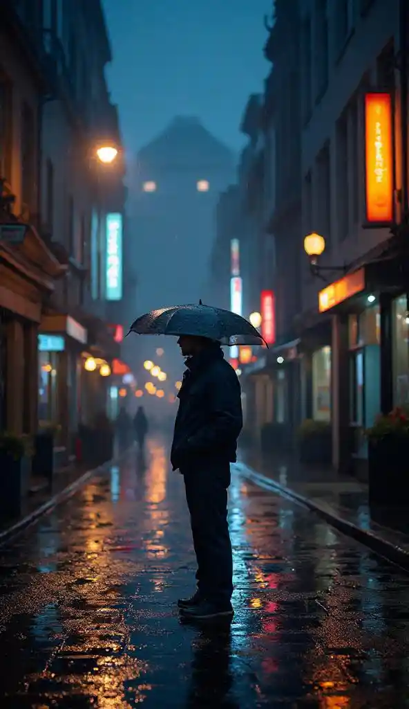 ( are high resolution ), (8k), ( very well detailed ), ( best quality ), (photorealistic:1.2), ((in the rain、Standing in a downtown area at night with rows of