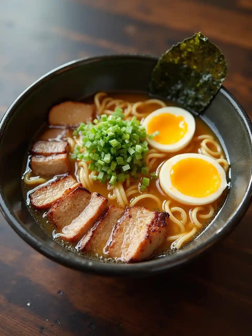 A bowl of ramen noodles with pork, egg, seaweed, and scallions in a rich broth