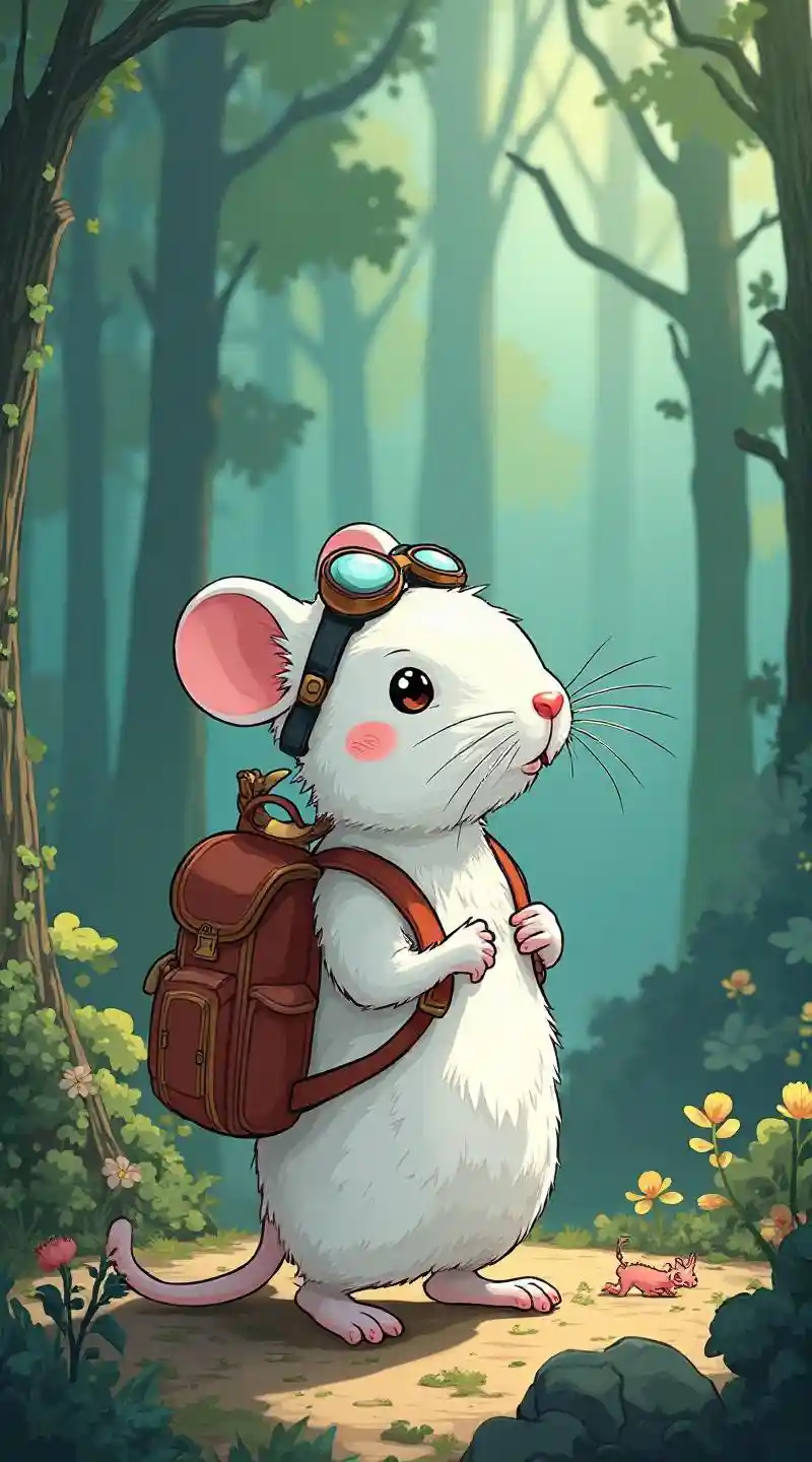 cute illustration、wallpaper、An interesting composition、 White Ratの冒険家 、 The Traveling Mouse _ backpack 、 Old Goggles 、White Rat 、((( The Endless Forest