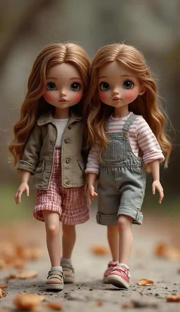 ((Dolls are walking together)). photo 8K Ultra HD, ((Masterpiece, best quality)), extremely Realistic, ((full body view)). capturing dolls, detailed face skin t