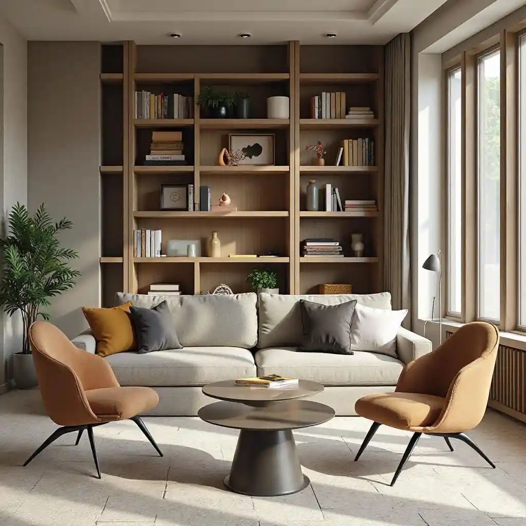 high-definition RAW color photo, Hyper realistic and hyper realism Photo, Geometric room interior with stylish wallpaper, square bookshelf, round table and tria