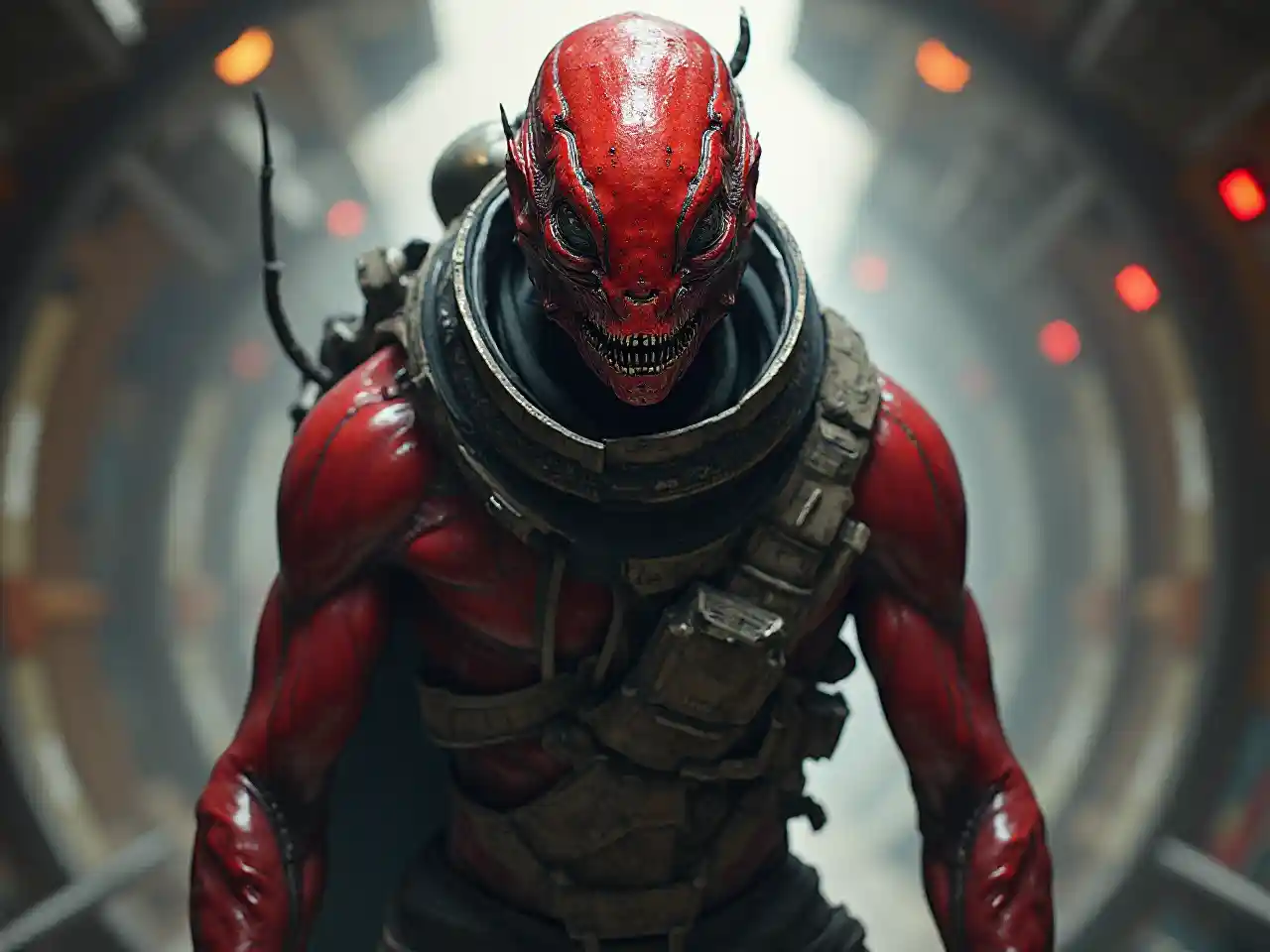 Anthropomorfic alien character with red skin, as a scifi mercenary, insect like, front view, medium shot, spaceship interior background, epic poster art by greg rutkowsky, scifi, fantasy, action, breathtaking, digital painting, highly detailed, pinterest, artstation, eve online, starfield.