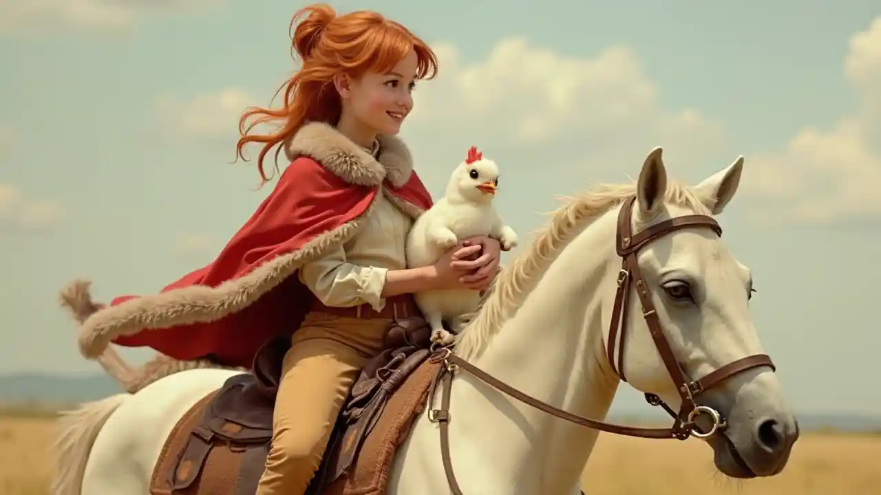 A photo of a very pretty redhead woman riding a cream color horse while holding a chicken and a white rabbit. The girl is wearing tan colored pants and shirt, and a red cape with fur lining all around the edges.