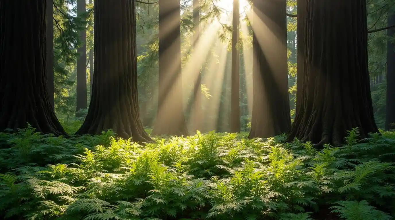 Redwood forest, sunlight filtering through the canopy onto a carpet of ferns.
