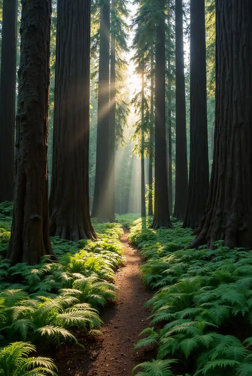 Redwood forest, sunlight filtering through the canopy onto a carpet of ferns.