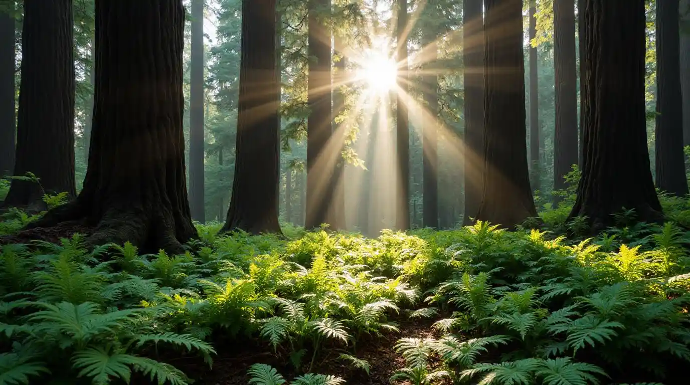 Redwood forest, sunlight filtering through the canopy onto a carpet of ferns.