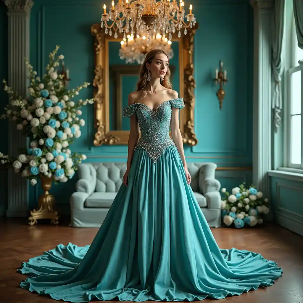 A stunning scene unfolds in a lavishly decorated ballroom, where a graceful figure stands at the center, draped in an opulent, shimmering turquoise gown adorned with intricate silver embellishments. The gown’s off-the-shoulder neckline highlights the elegance of the wearer, whose confident posture and piercing gaze exude an air of regal sophistication. Surrounding her is an exquisite arrangement of blue and white roses, adding to the romantic ambiance enhanced by the warm glow of ornate chandeliers overhead. Enveloping her are rich turquoise walls and luxurious drapes that complement the regal decor, while the polished wooden floor reflects the soft light, creating a sense of grandeur and timeless beauty. The overall atmosphere suggests a moment frozen in time, filled with elegance and a hint of enchantment.