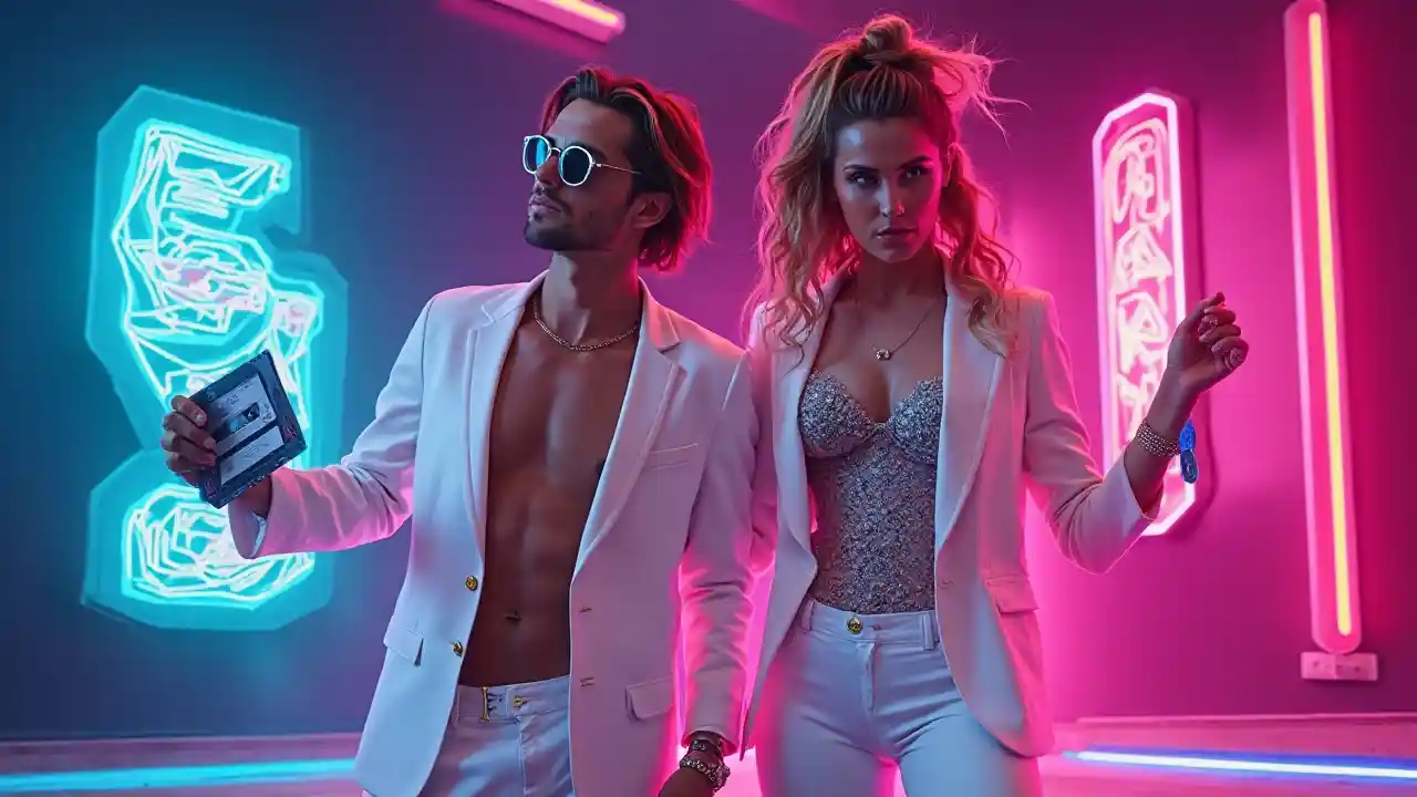 80's Back To The Future style retro party poster featuring guy and girl in white Miami vice suits, holding cassette player, neon vibrant colours, synthwave, disco vibes,