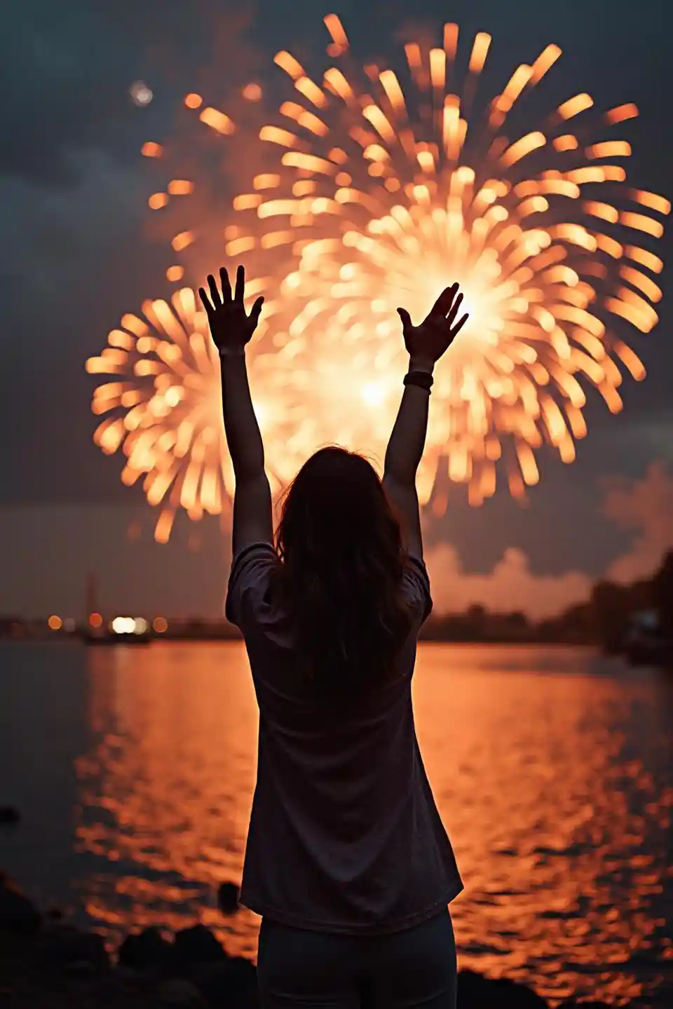 An expression standing with a happy expression looking back on something while raising hands as if hooray against the backdrop of a huge river,The many firecrac
