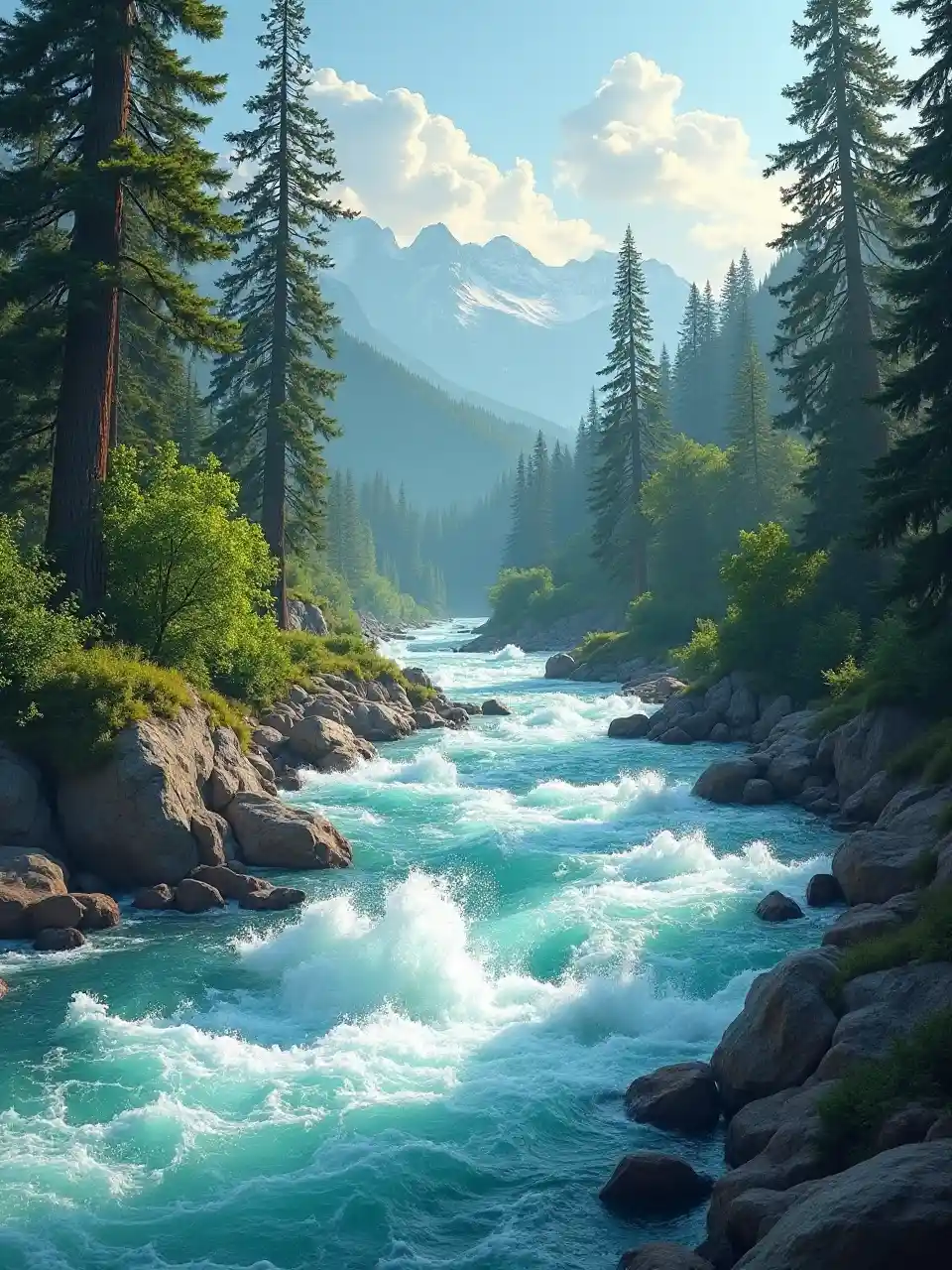 Rushing rapids in a crystal clear river, surrounded by towering trees and lush vegetation, energetic, serene, high detail, river landscape