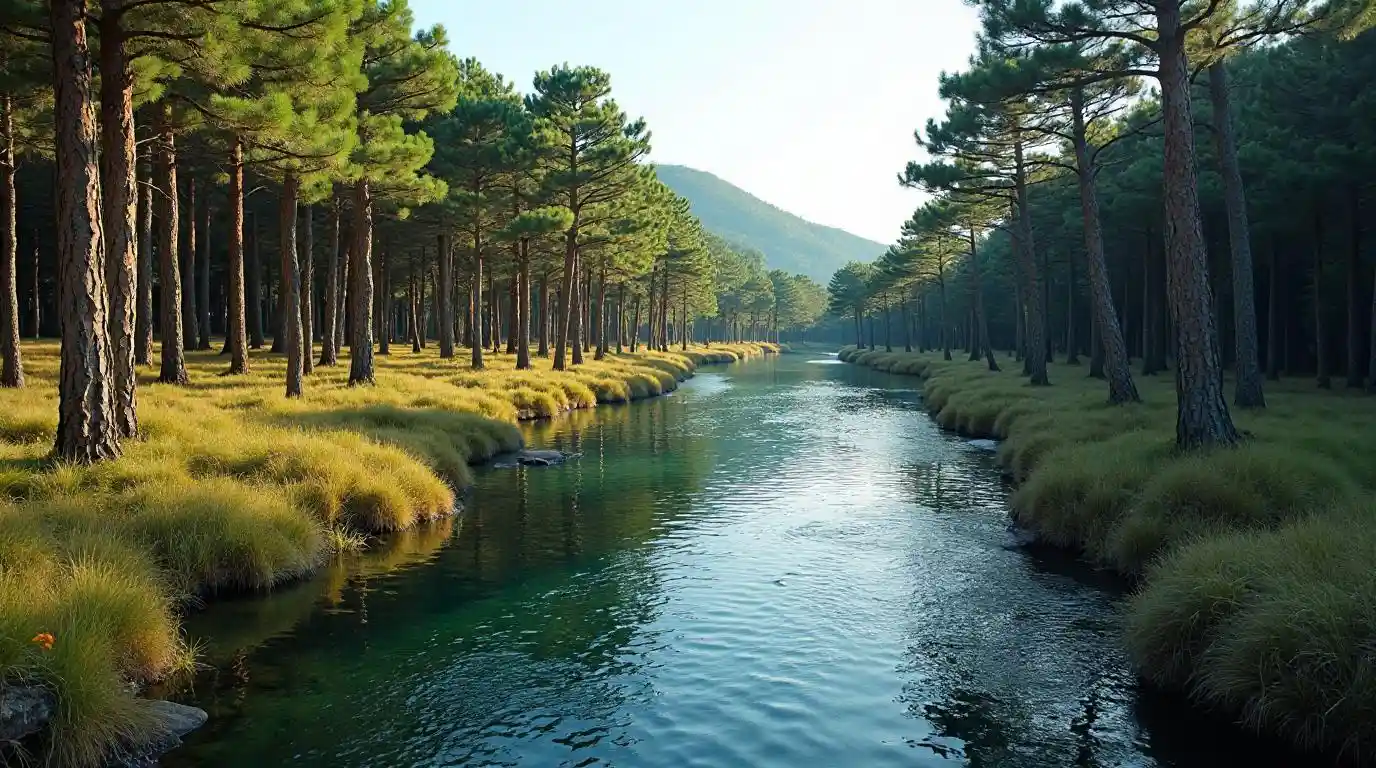 A winding river with strong towering Canary Island Pine Trees on near the riever