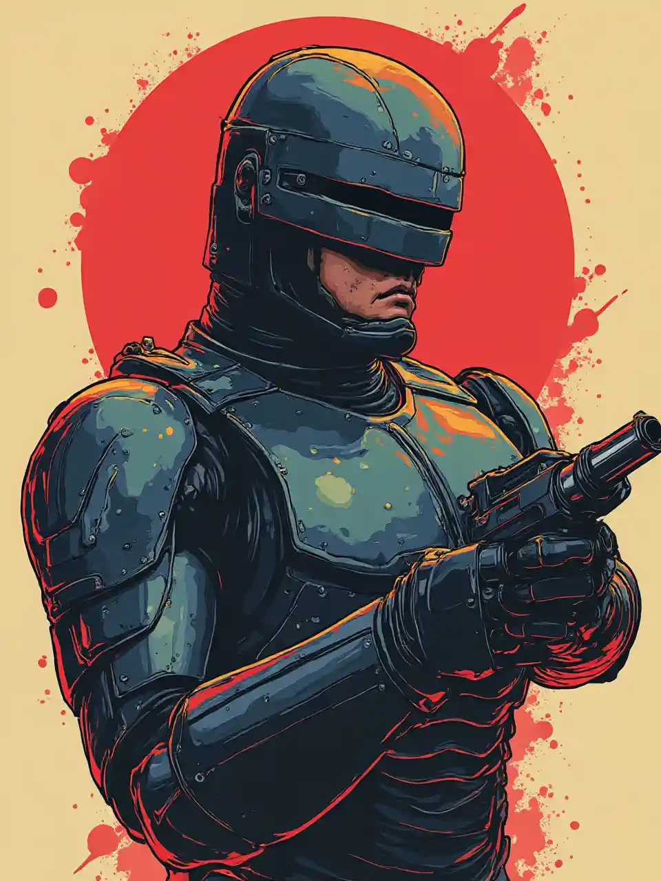 Robocop 1984 style eye-catching poster-style drawing and illustration representing the iconic pulp style