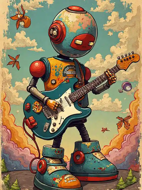 (((plays retro collage art、collage)))、Cheerful guitarist robot , cuteロボット、Fender Stratocaster、Earth Colors , punk , happy , Optimistic , Don Hertzfeld , H