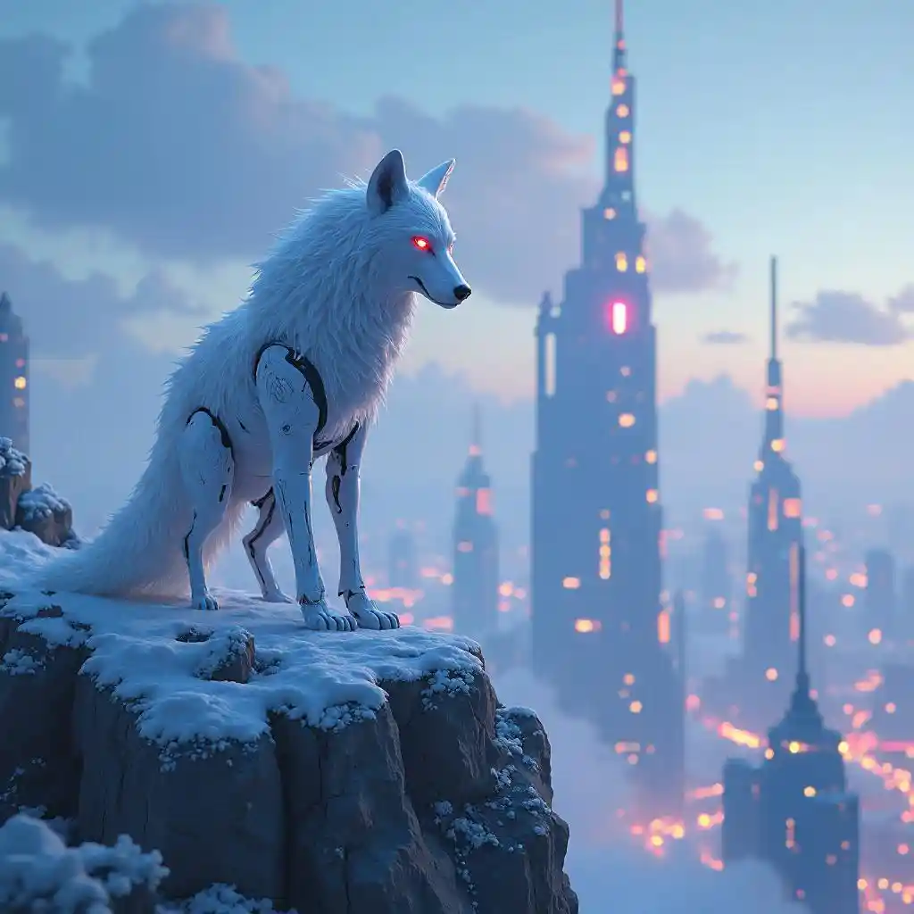 KittyA snow robot wolf with neon eyes,standing on a cliff overlooking a futuristic megacity