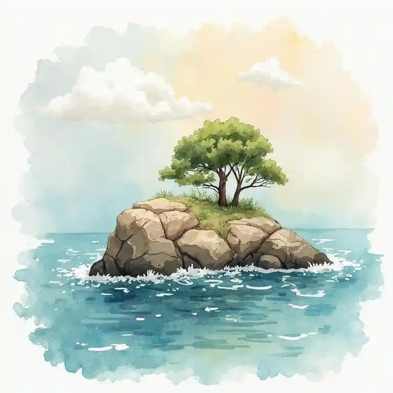 IsaiahI am a rock, I am an island, rocks don't hurt, islands don't cry, watercolor style, blotches, brushstrokes, storybook aesthetic ,