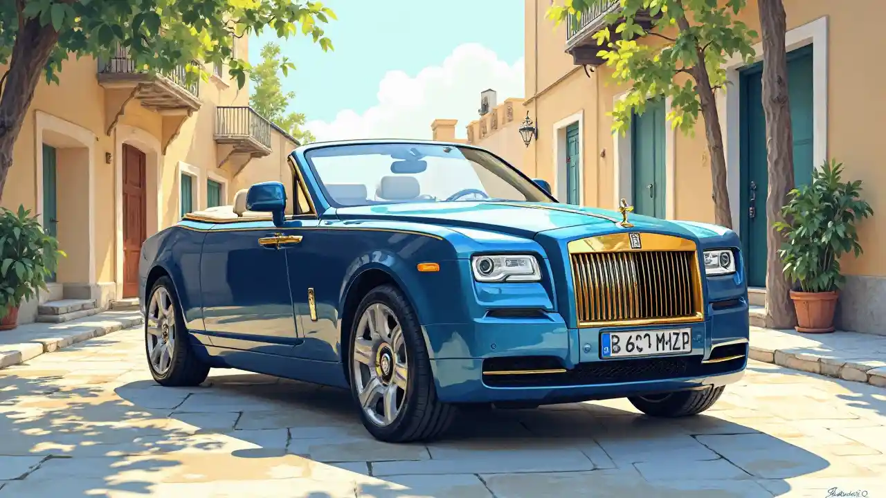 Blue Gold Convertible Rolls Royce Greece Watercolor