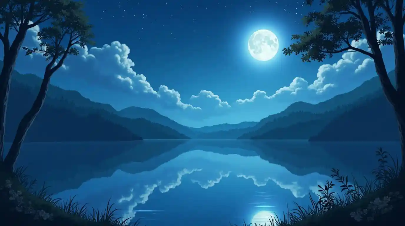 Ethereal lakeside, moonlit dance of spirits, reflecting romantic supernatural anime.