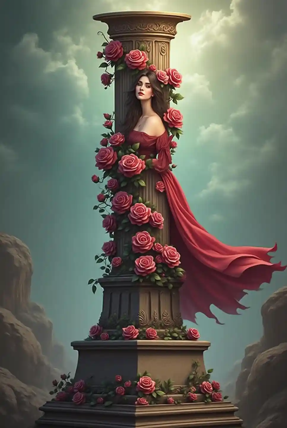 Beautiful roses Wrap around the Column, A sorceress with Beautiful Facial Features and Light Makeup, decorations, the column stands on a huge pedestal with spar