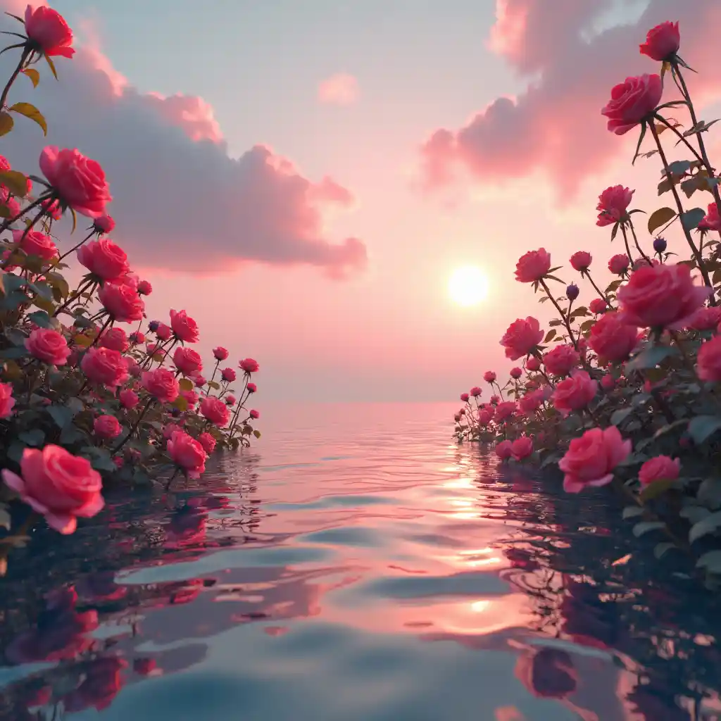 A (((sea of water))), its surface (mettling with gentle ripples) under a (clear sky awash with a soft, rosy glow)) that reflects off the (stems and leaves of (red roses)), creating a (dreamlike atmosphere).