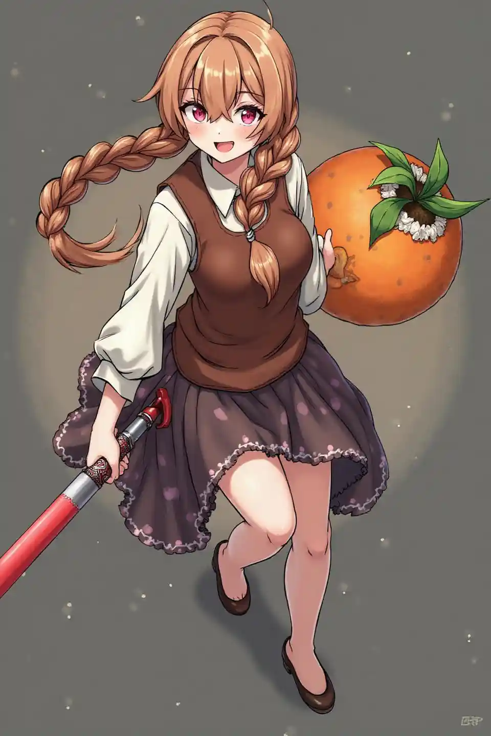 masterpiece,best quality,amazing quality, 1girl,Rosette_Savigny_DEEP_ONE,brown hair,long hair,red eyeslong braid,big braid,(((Watermelon sword)),(((orange shiel