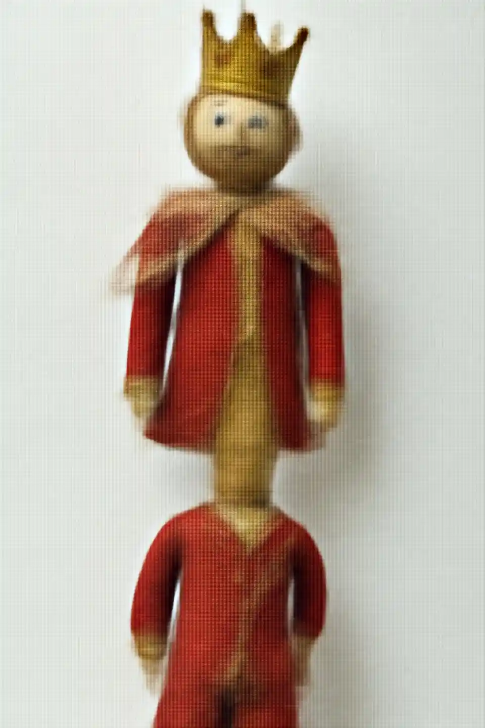 a wooden marionette puppet with natural proportions, wearing a tattered red and gold royal outfit with a crooked golden crown and frayed cape, standing still on