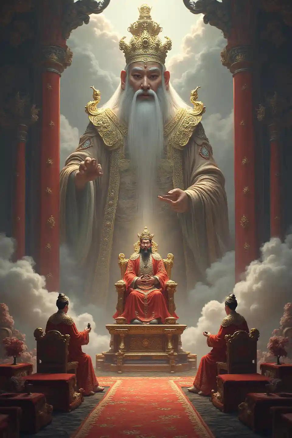 The ancient palace is located above the clouds, The main hall of the royal palace , emperors are seated on thrones ,The majestic 、 with a magnificent face .