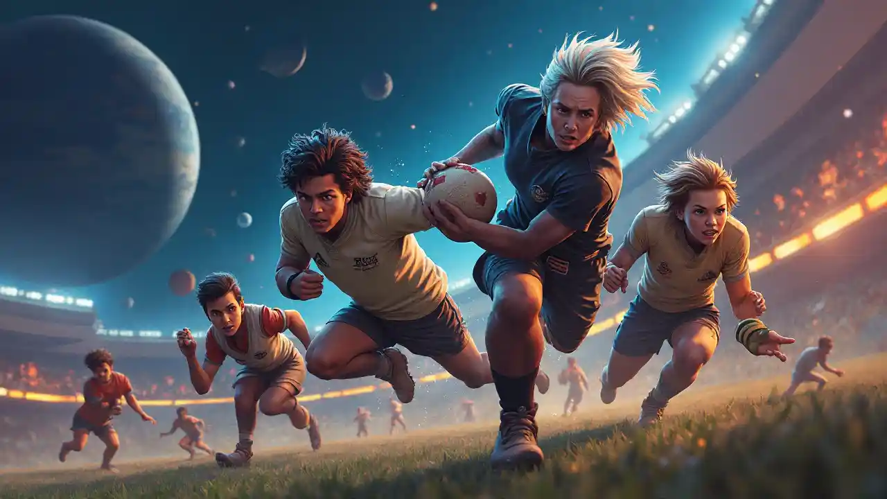 Star Wars characters playing rugby, action-packed sports scene, vibrant colors, dynamic poses, expressive faces, a cosmic stadium backdrop with stars and planets, intense athlete expressions, dramatic lighting enhancing the mood, high-energy atmosphere, ultra-detailed, fantastical theme, combining sci-fi elements with athleticism, showcasing teamwork and competition in a playful and adventurous setting. <<THE_MARKER>>