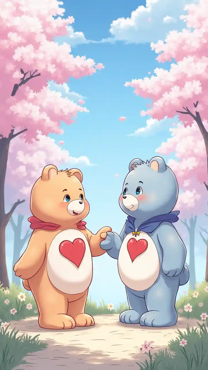 Anime illustration of Care Bears dressed as Sailor Moon characters under cherry blossoms.