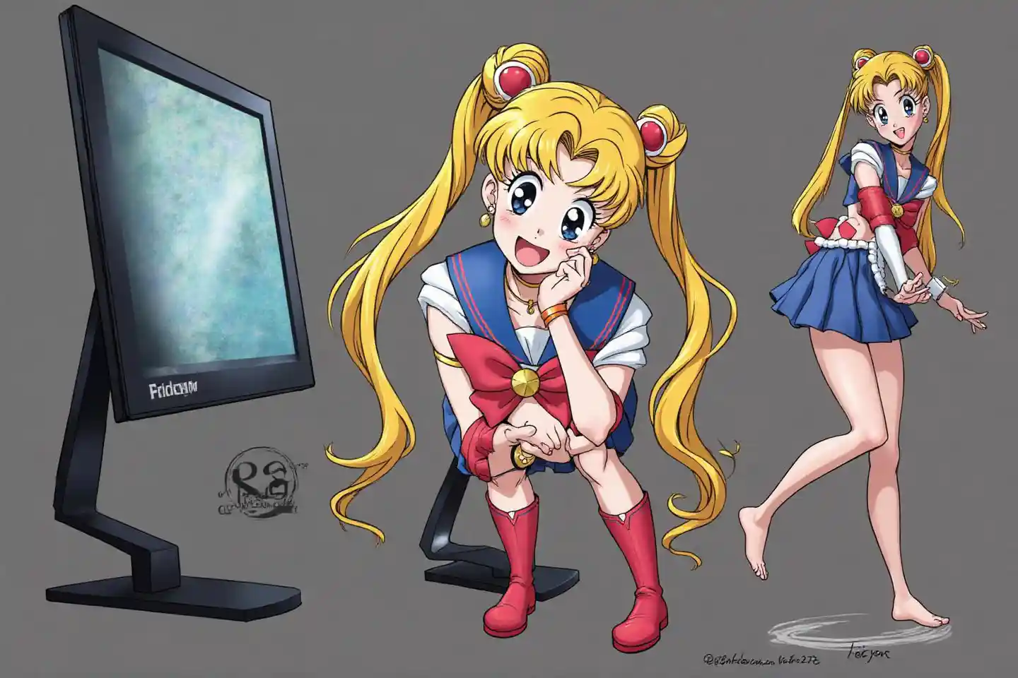 EastonCreate a highly detailed, absurdly impractical office accessory: "The Sailor Moon Monitor Stand Deluxe" Visualize a life-sized Sailor Moon figure (5'2"/157cm t