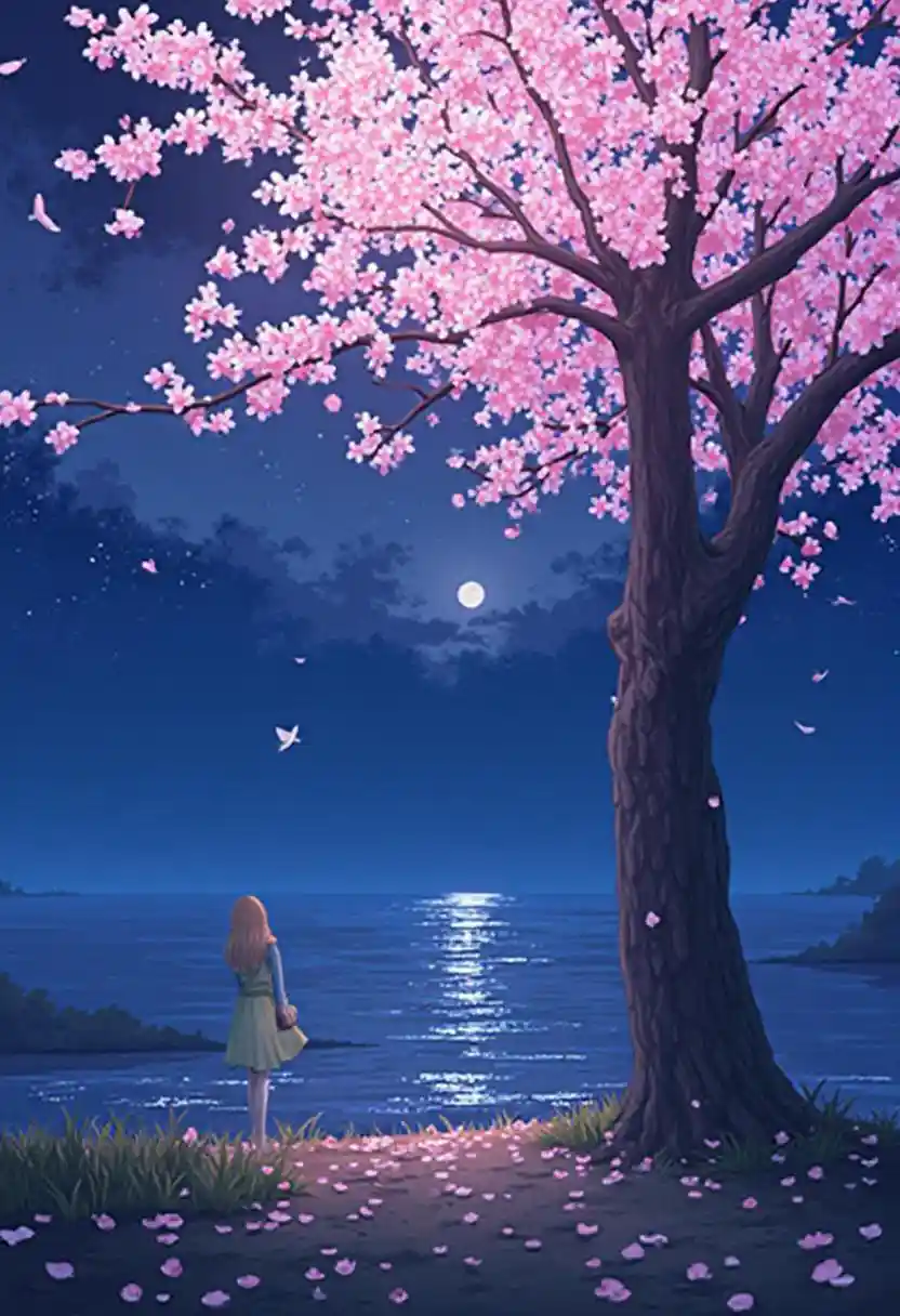 Imagine that it is night, and there is a fate in the moonlight where you see MaMatou Sakura (Masurikura) [[Fate/Stay Night]] staying under a blooming sakura tre