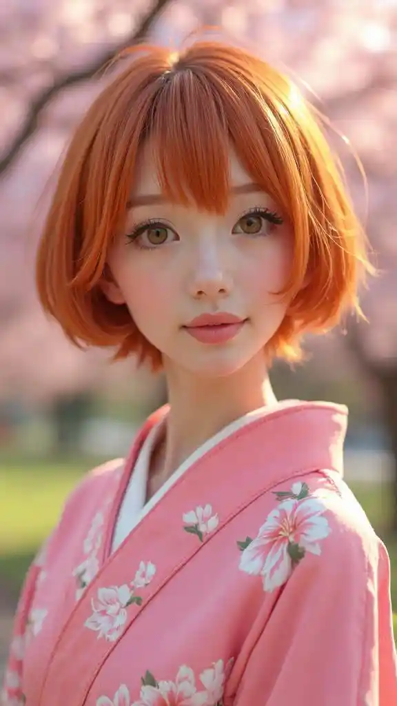 a woman, at the sakura park, sunny day, sakura pattern pink kimono , RAW, UHD, 8K, (closeup:1.1), head, highly detailed face, stunning eyes, orange short hair,