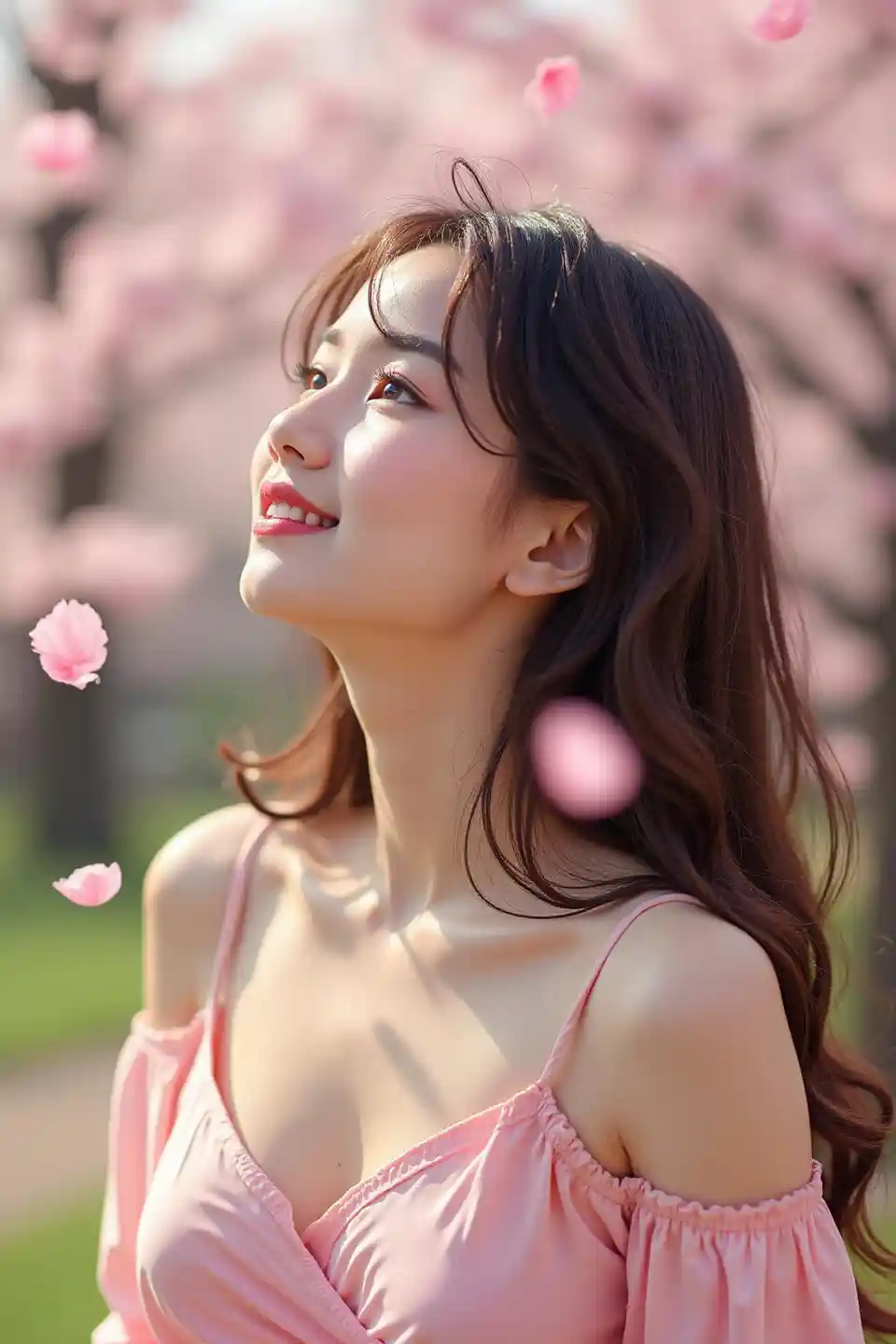 Emerydepicting a beautiful young woman above her chest at Sakura Season Park. ,gentle pink petals are fluttering through the air, creating a dreamy romantic vibe