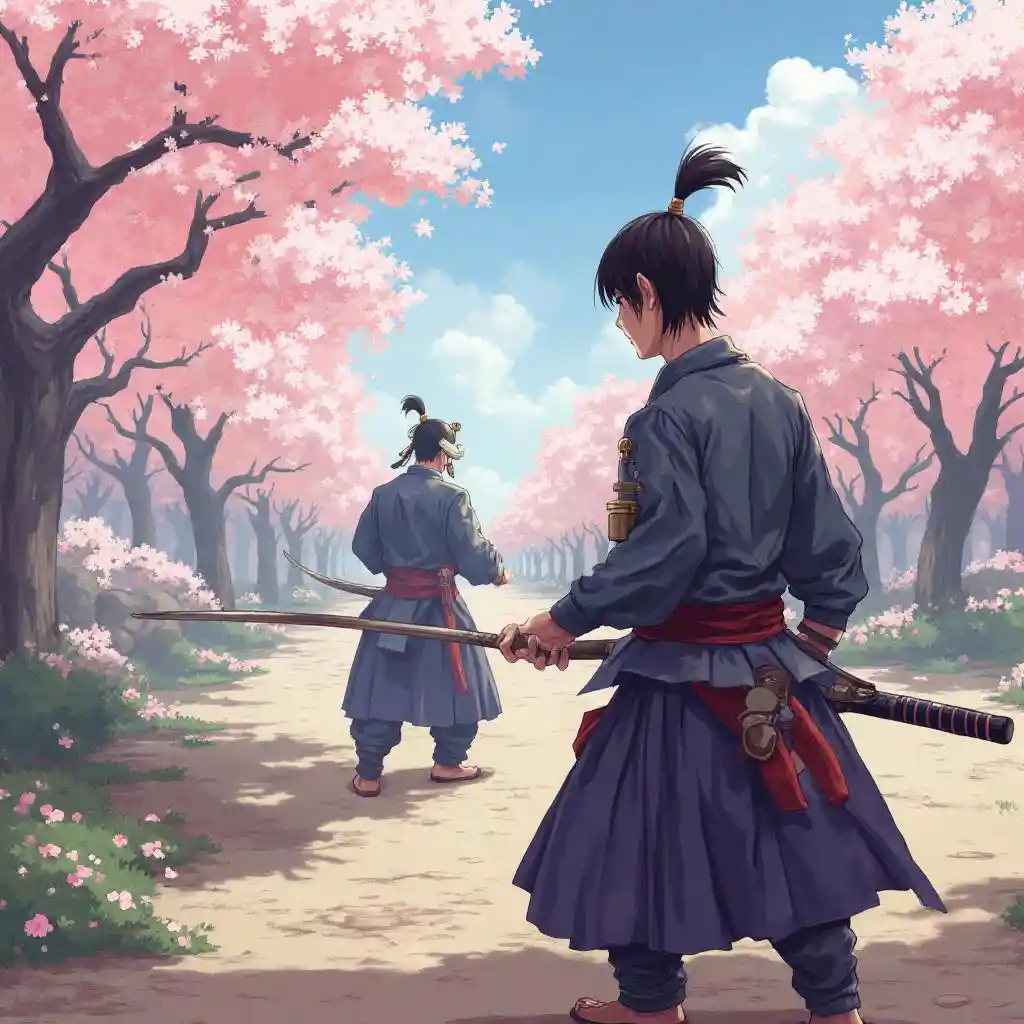 Samurai training under cherry blossoms, drawing inspiration from historical anime visuals.