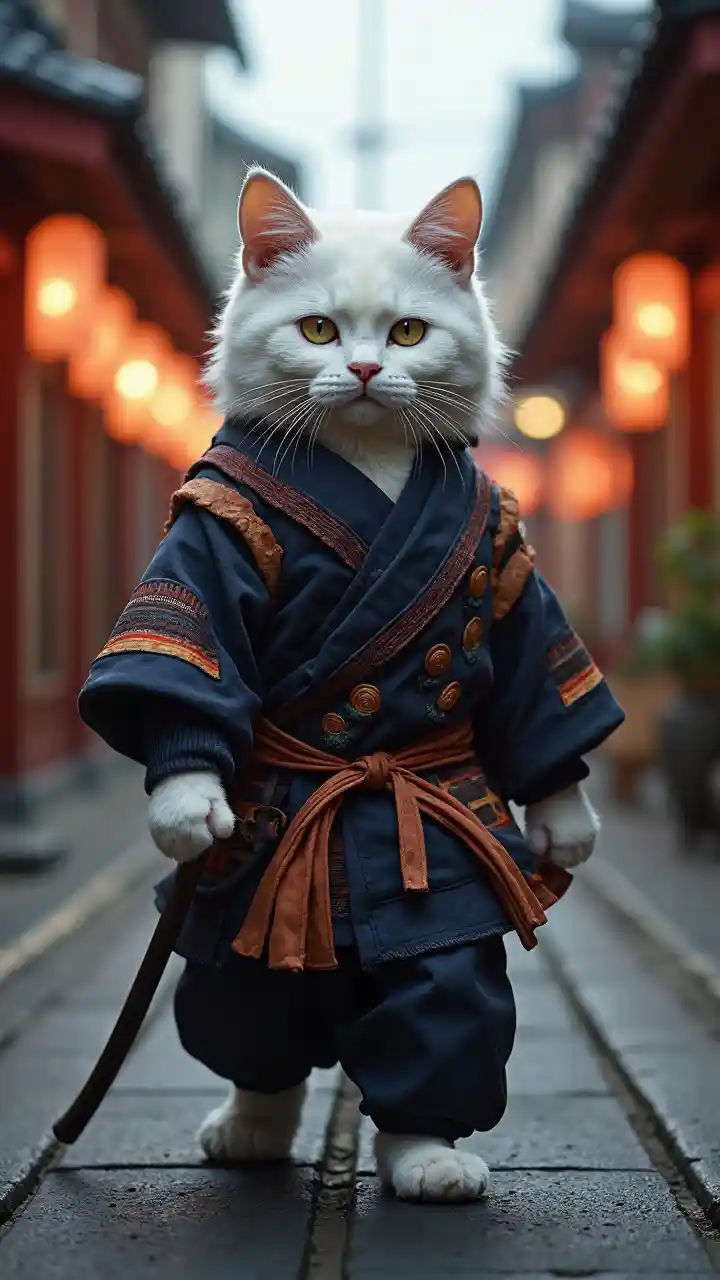 AlexanderWhite cat in samurai clothes in Japanese street, evening, high detail