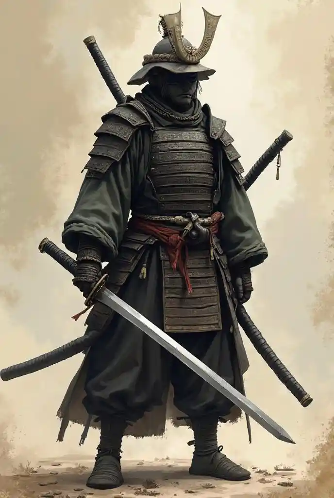 Chat is standing, he is your legs, dressed in the equipment of the samurai years. In his right hand is a katana