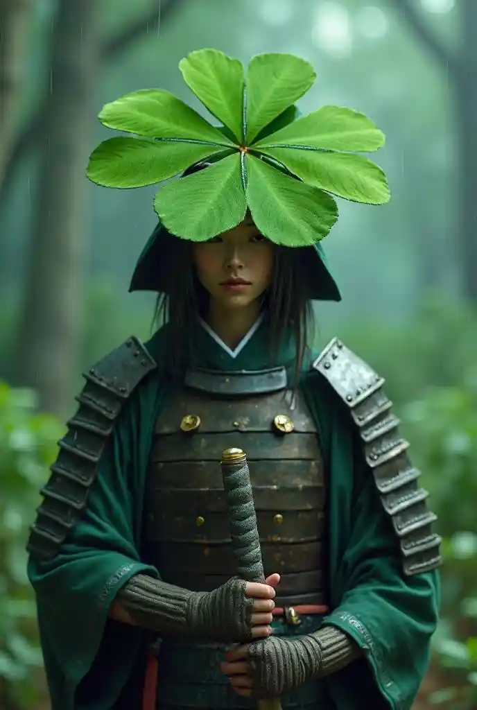(((holding a large three-leaf clover over her head to protect her from the rain, rain))), ((micro woman, samurai, Japanese sword on the hilt, Japanese armor, bl