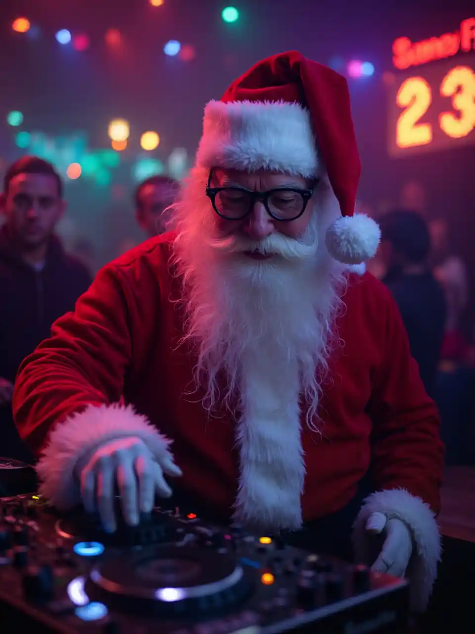 Santa Claus at a nightclub, party with Santa, Dj Santa, neon lightings,