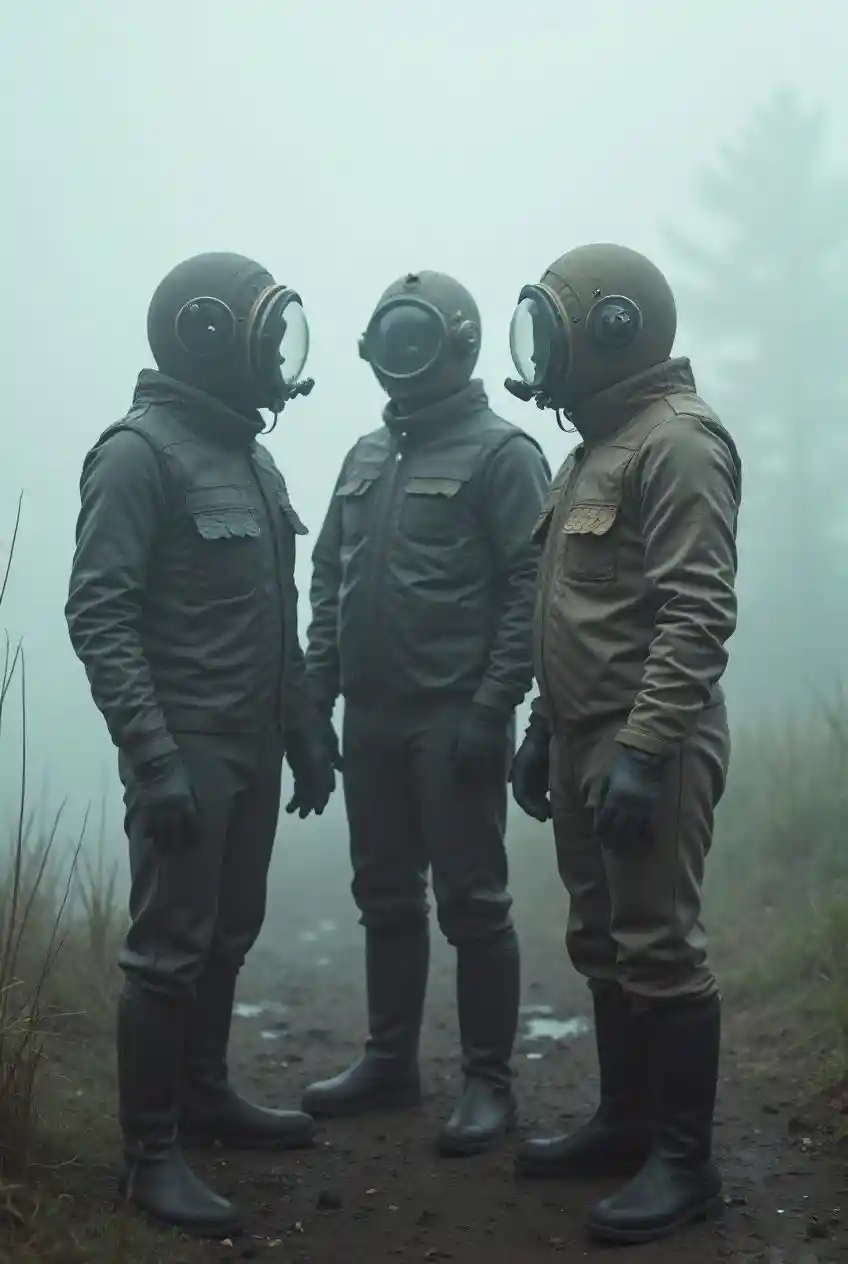 valued scales suit three man with vintage standard standing diving suit with Philippine pangolin scales on suit, scales as suit skin surface, person in a vintage retro diving suit, A misty haze obscures the surroundings, reducing visibility and creating an eerie atmosphere.