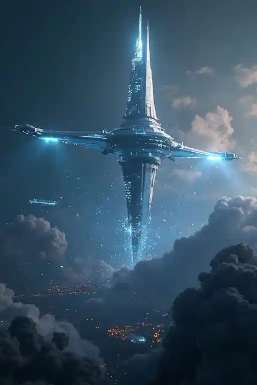BenjaminBest Quality、masterpiece、Half luminescence、glass texture、Light trail、Translucent design、Sci-fi item、Futuristic、giant spaceships、 floating building、shining futur