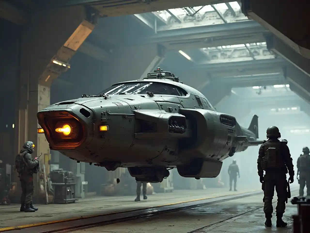 graceRealistic sci-fi military hover cycle in a hangar with soldiers.
