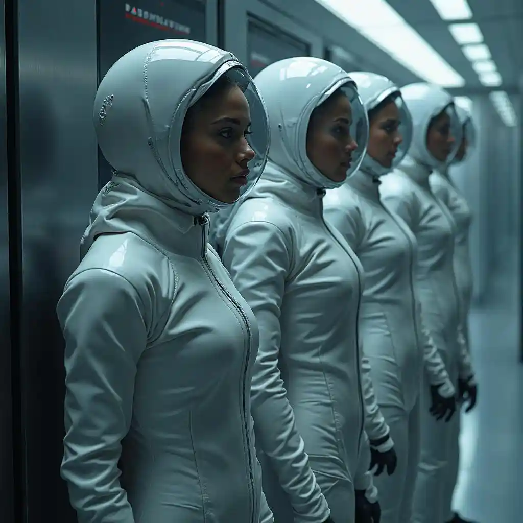 Cinematic scifi photo, photorealistic masterpiece of several young slim women and men (((completely covered by a sleek, form-fitting closed space suit))), compl