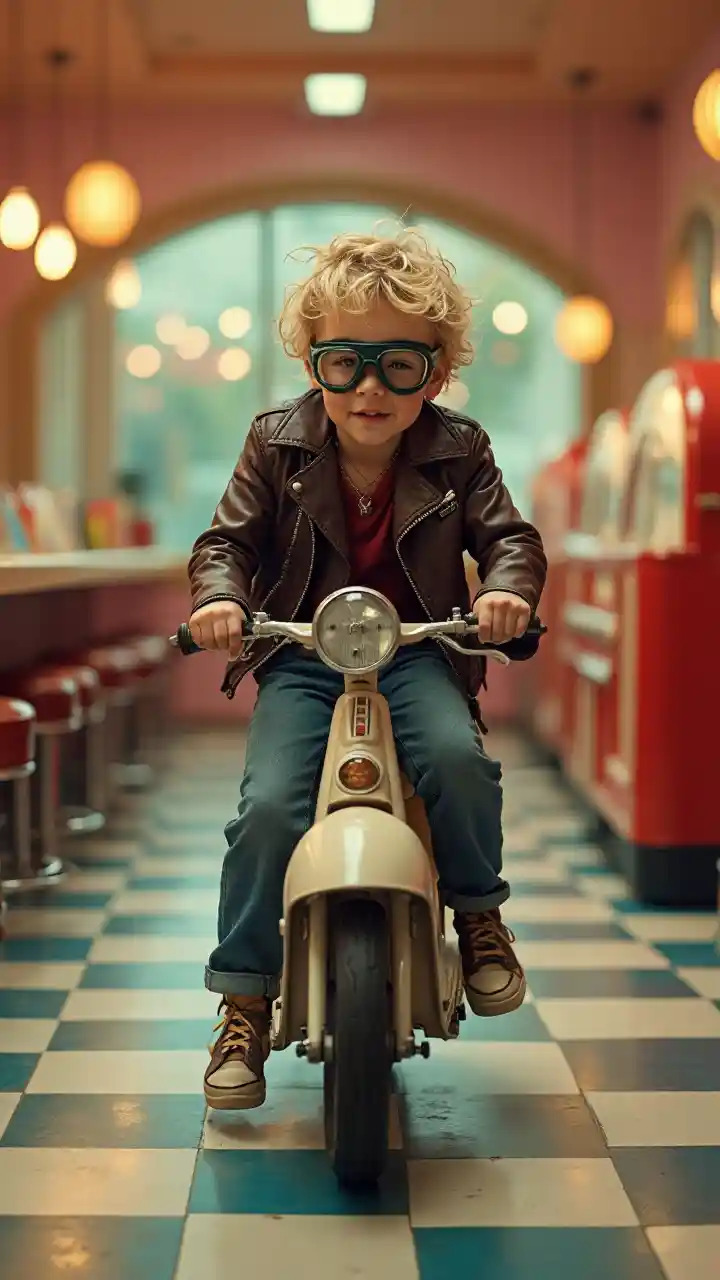 A 6-year-old White boy with messy hair rides a scooter through a retro diner, wearing a leather jacket and aviator goggles. Checkered floors and jukeboxes frame him, his speedy swerve exuding rebellion and nostalgic charm in a vibrant, 1950s setting.