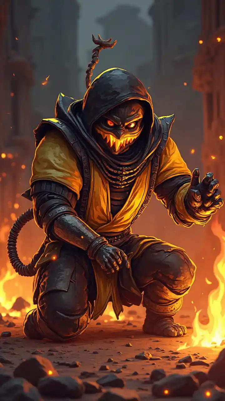 Scorpion from Mortal Kombat, cartoon style, fire, dead