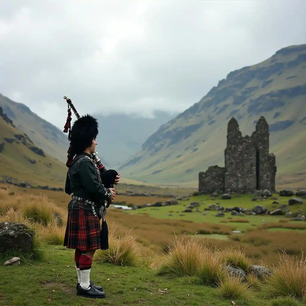 Scottish highlands, with lone bagpipers playing among stone ruins.