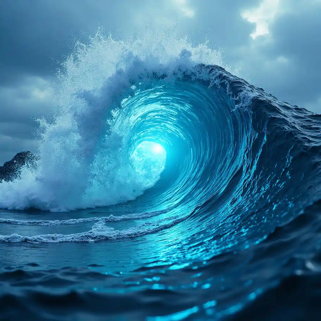 (SeaArt logo in computer data format with several codes forming a seawater tornado), an intense energy coming out of the center of the whirlpool and several dif