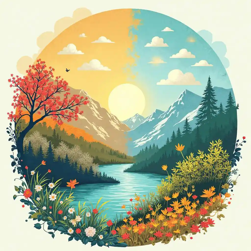 "Create an image that visually represents the concept of 'ऋतु-विचार' or seasonal reflections in Nepali culture. The image should depict the six major seasons (वसन्त, ग्रीष्म, वर्षा, शरद, हेमन्त, शिशिर). Each season is represented through natural landscapes and associated cultural elements. For example: Spring (वसन्त): Blooming flowers, lush greenery, vibrant fields Summer (ग्रीष्म): Bright sun, warm weather, dry fields Monsoon (वर्षा): Heavy rain, rivers and lakes swelling, lush vegetation Autumn (शरद): Harvest scenes, golden fields Winter (हेमन्त): Cold atmosphere, foggy mountains Late Winter (शिशिर): Snow-covered landscapes, crisp air Incorporate elements like Nepali festivals or traditional cultural activities that are linked to these seasons (e.g., celebrations of Makar Sankranti, Holi, and Tihar). Use vibrant colors for the different seasons to give a sense of transition and harmony with nature."