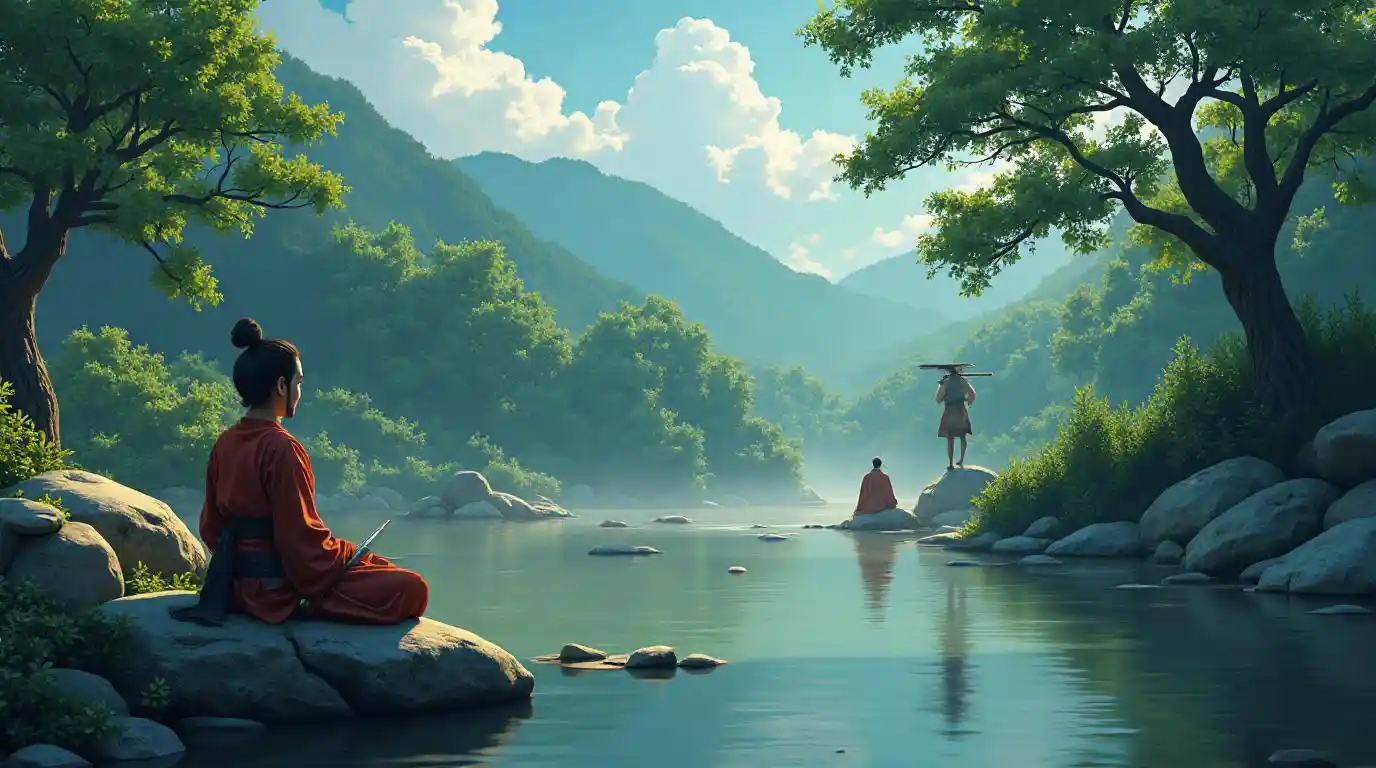 LukeTranquil zen garden, samurai meditating, spirits wandering, echoing serene historical anime.